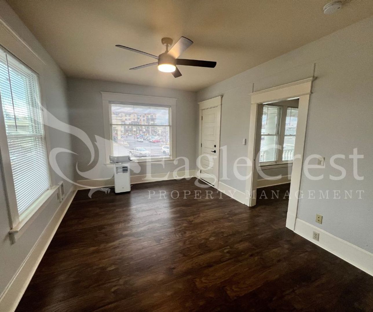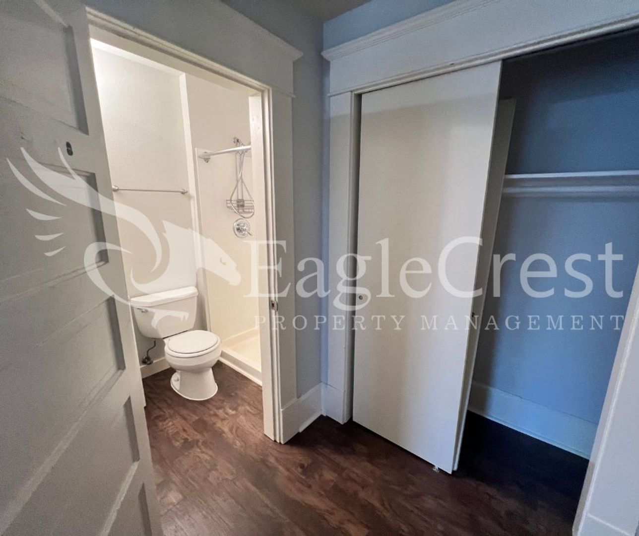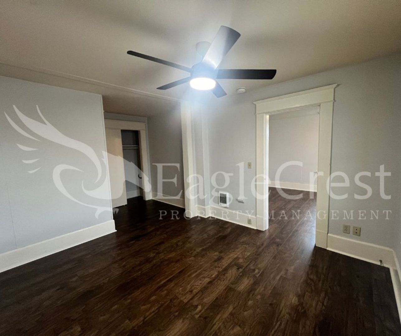 This nice size 1 bedroom, 1 bathroom apartment is located on the second floor and offers beautiful laminate flooring throughout along with updated light and fan fixtures. The living space includes balcony access, providing a comfortable extension of the home and a portable AC. The kitchen comes equipped with a refrigerator and electric stove, and residents have access to a shared, coin-operated laundry area on-site.