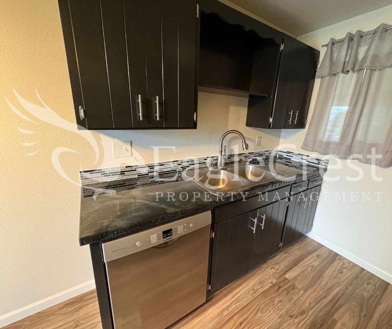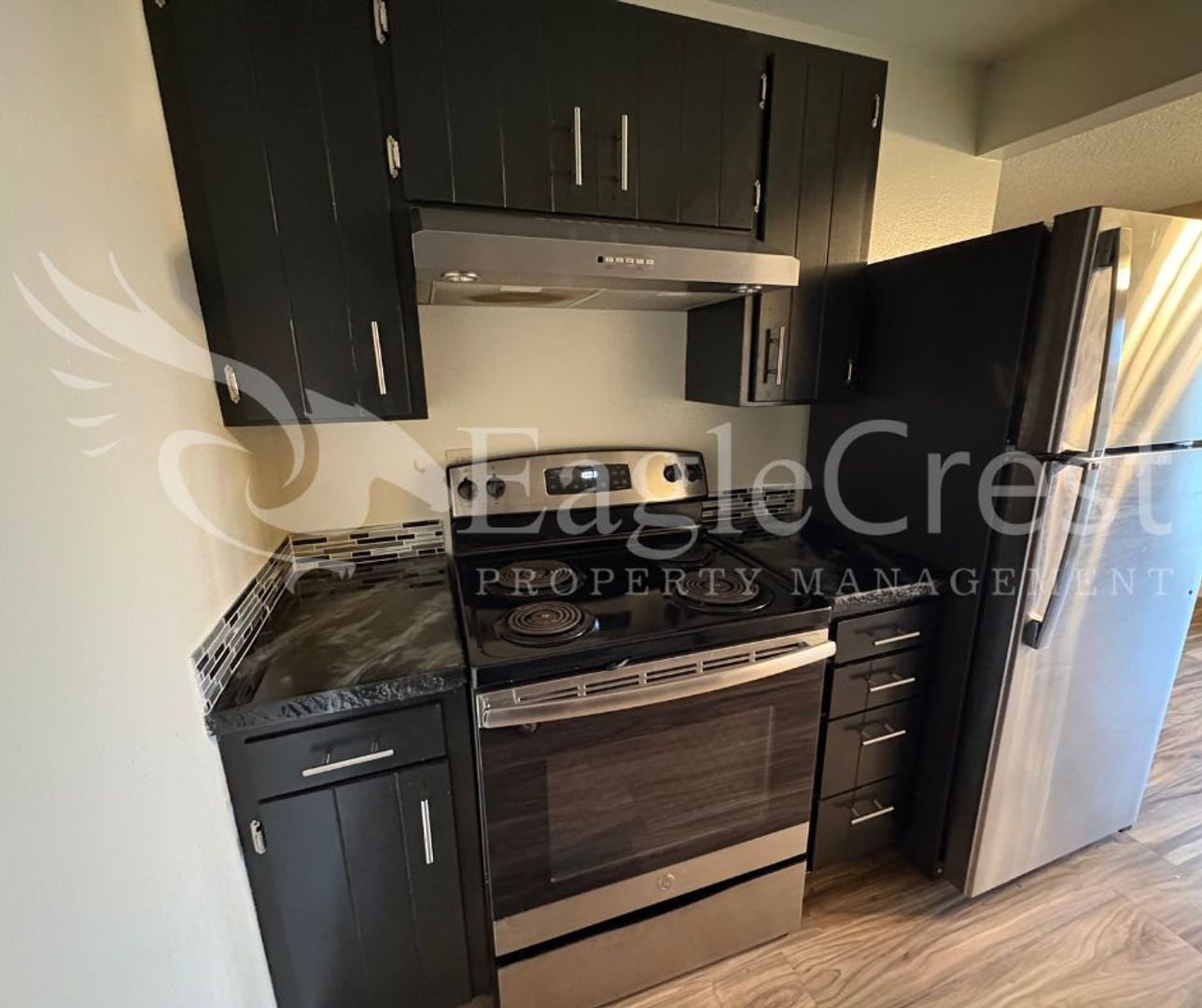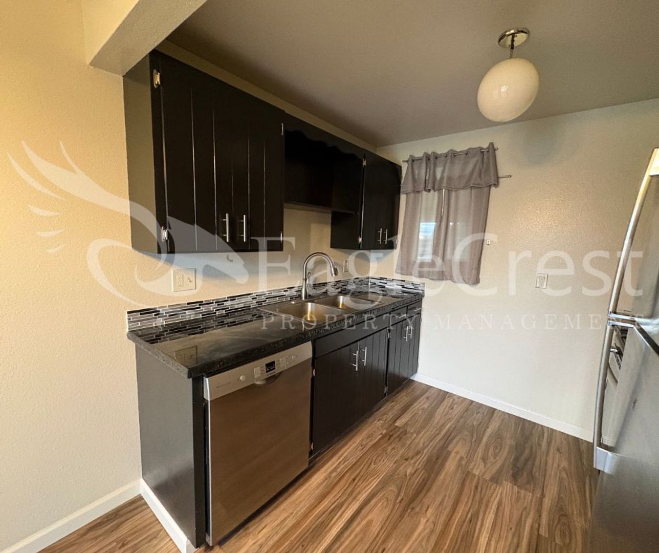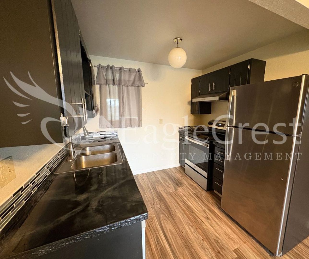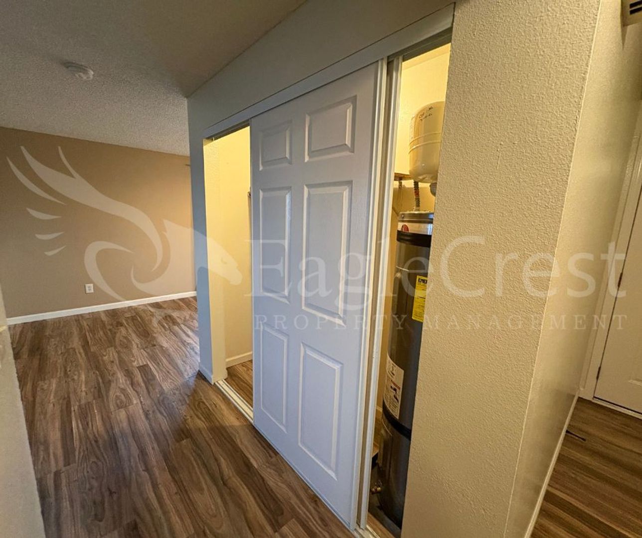 Step into this inviting 2-bedroom, 1-bath upstairs apartment featuring laminate flooring throughout, a spacious primary bedroom, and a full bathroom with updated fixtures and plenty of cabinetry for storage and a full tub/shower. The kitchen also offers generous cabinetry, epoxy countertops, and newer stainless steel appliances—including a refrigerator, dishwasher, electric stove, and hood range. Enjoy your own private balcony with a privacy wall, plus convenient amenities such as a shared laundry space, two personal storage units per unit, assigned carport parking for one car and plenty of on street parking for guests. Residents are responsible for electricity and a flat-rate fee of $75.00 for water, sewer, and garbage in addition to rent.